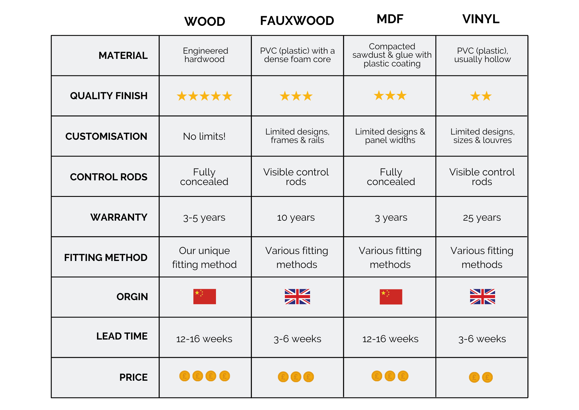 We also provide a UK-made, short lead time option with our Faux Wood range. It's much more limited to just simple windows and there are some compromises with visible control rods, louvre sizes and rails to consider. But a good option if you can't wait for wooden shutters.